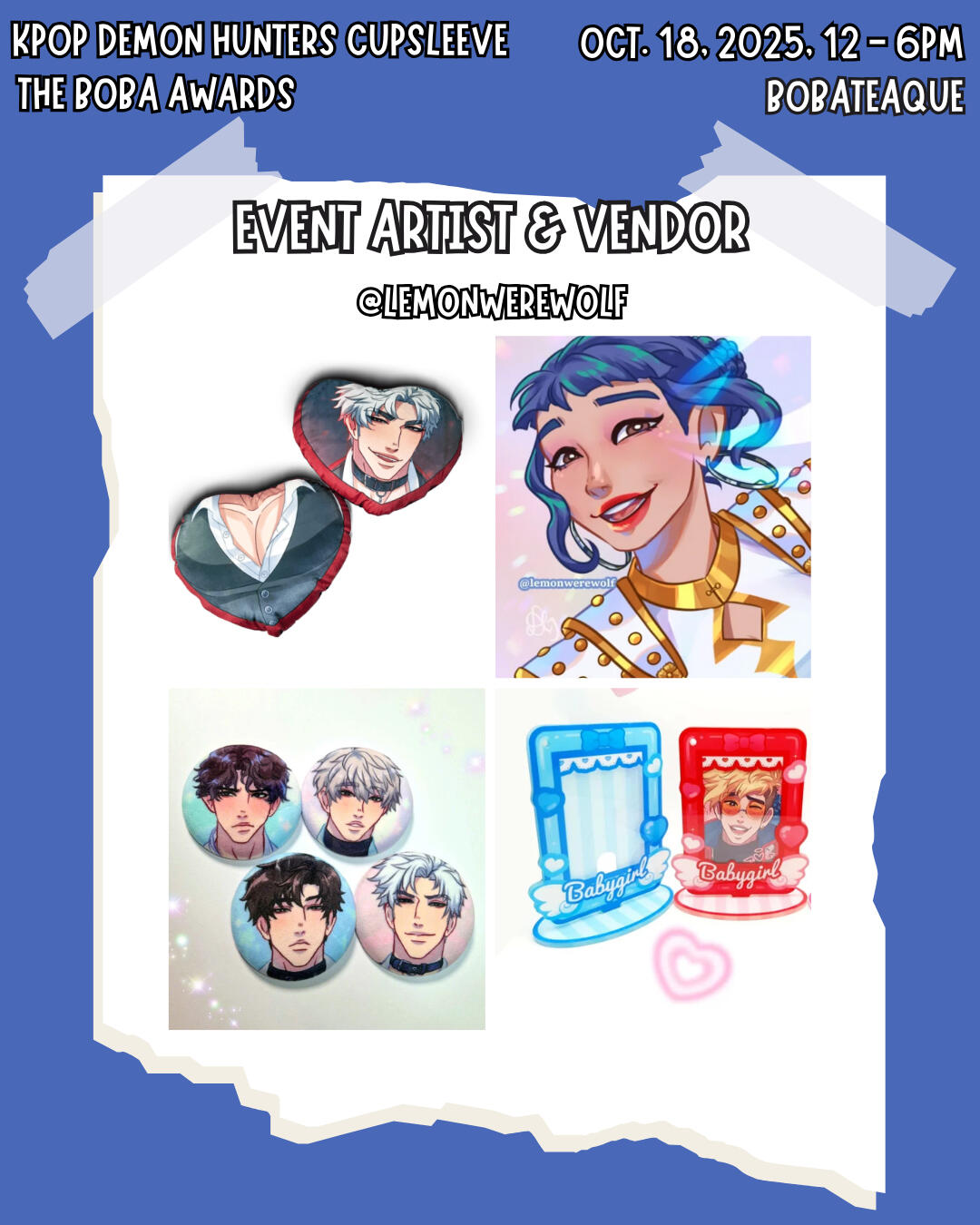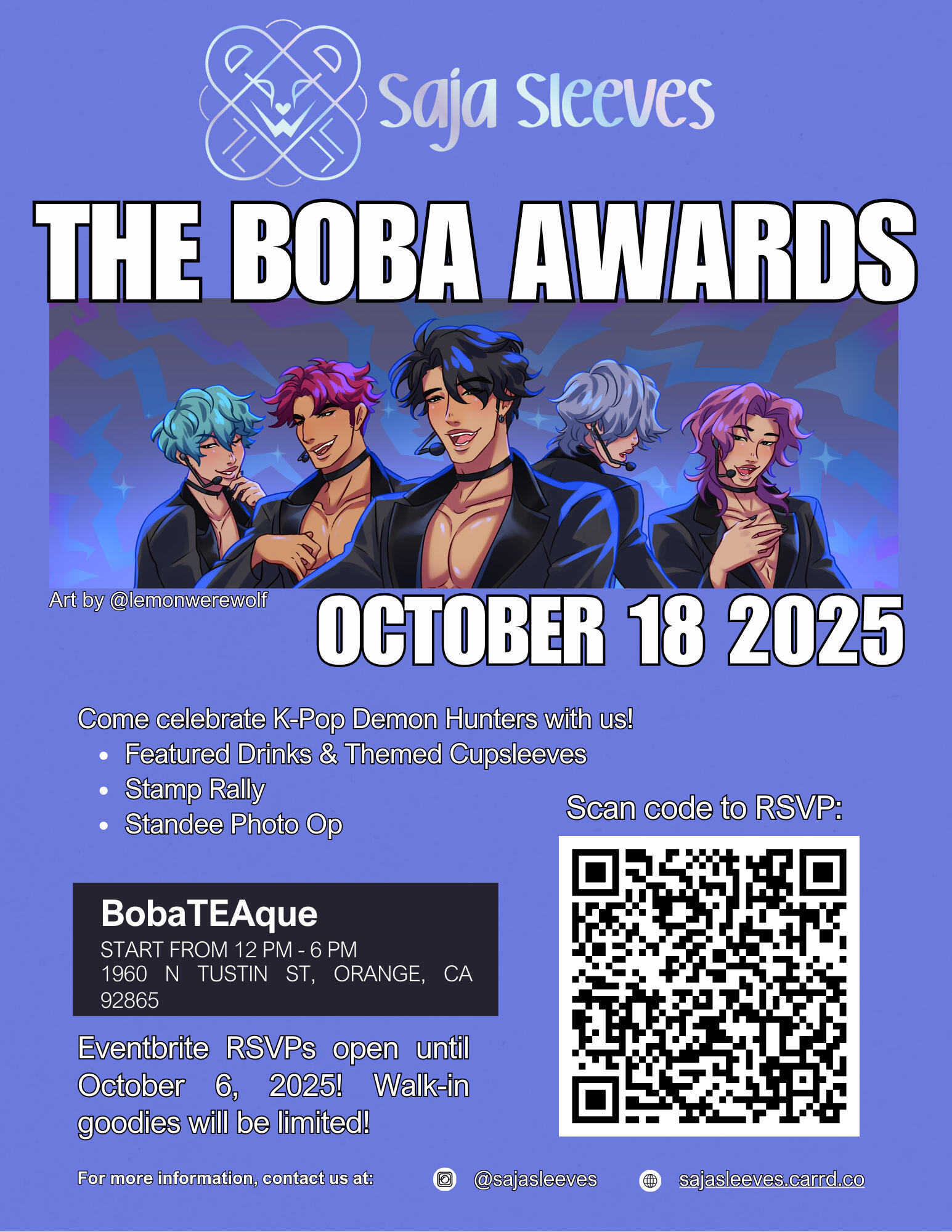 - Please respect the BobaTEAque team since they are generously allowing the Saja Sleeves team the space to host this event.- Please also respect the Saja Sleeves team, the volunteers, the vendors, and any of the event equipment. We are all working together to bring this event to life.- Since K-Pop Demon Hunters is marketed with a PG rating, please keep in mind there may be a possibility of the parents and their children attending this event. We ask that attendees be mindful of the content of conversations when families are present.- Please do not touch the HUNTR/X and Saja Boys standees. These are to be auctioned off during the event. We would like for these to be their best condition for the auction winners.- Cosplay is not consent. Please request permission to take a photo with any cosplayer during the event. Refrain from touching anyone without their consent. Failure to do so would result in a warning and any additional violations will lead to a request for departure. As attendees and event runners ourselves, we take safety seriously.- If you have any questions about the event, please locate the head staff dressed in a Saja Sleeves name tag on-site.